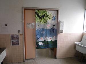 トイレのドアの開け閉めの時に、前後の子どもたちがけがをしたことが以前にあったようで、安全のため開け閉めできないようにひもで固定していましたが、この度、ドアを取り外し、のれんを付けて模様替えを行いました。