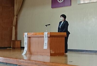 新任式では、新たに11名の職員を迎えました。始業式の校長の話では、今年度頑張ってほしいこととして、「集中力」と「協力」を示し、授業に集中してしっかりと学力を身に付けることと、友達と力を合わせて仲よく活動することを通して、素晴らしい学校にしていくよう子どもたちを励ましました。