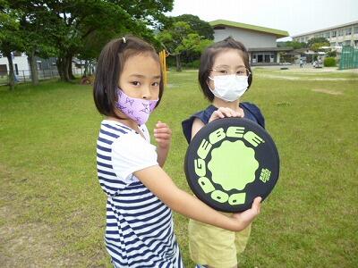 昨年度の3学期に、集めていただいたベルマークで、ドッジビーを購入していただきました。前回は4年生以上の学級にドッジビーを配付しましたので、今回は、1~3年生と、昨年度なかった4年2組の学級に配付しました。天気のいい日は、昼休み時間に楽しそうに遊ぶ姿が見られます。