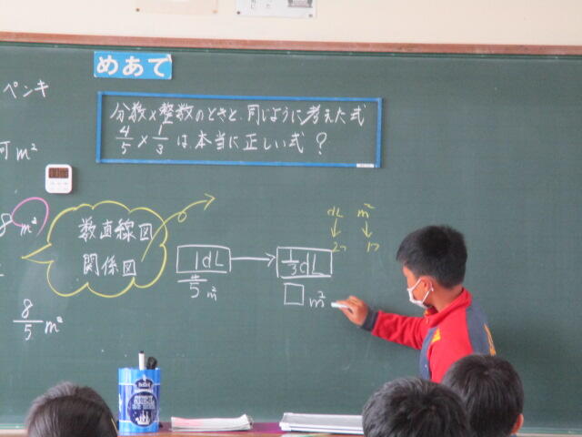 「分数をかけるかけ算」の計算のしかたについて、数直線図や関係図を使って、自分の言葉で説明しようと集中して学習しています。ペアや小グループでの対話を大切にしながらも、本時間のポイントは全体でしっかりと確認し、学習内容を身に付けています。