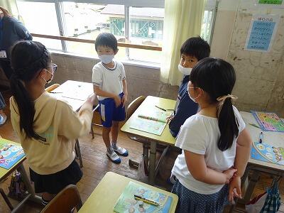 相手の目を見て、大きなジェスチャーをすることがポイントです。みんな笑顔で初めての外国語活動に親しんでいました。これからもみんなで楽しく勉強をしていきます。