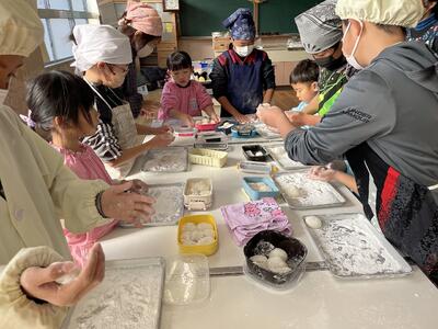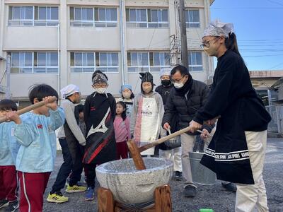 一ッ岡南幼稚園の年長さんとリズムを合わせてお餅をつきました。初めての経験だったという児童も多く、楽しかったようです。つきたてのお餅は、上手に丸めて、みんなでおいしくいただきました。