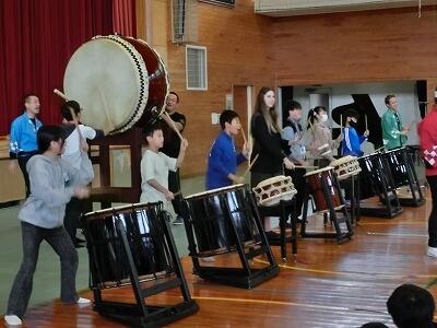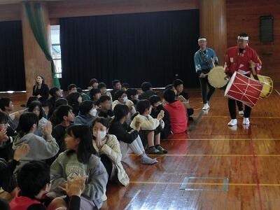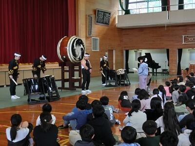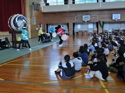 本日、2・3校時に、鑑賞教室を行いました。今年は、「橘太鼓『響座』」の方々を迎えて、太鼓や篠笛の演奏を聞きました。1曲目は、大太鼓ソロ演奏でした。最初の1音が、想像以上に大きな音で、体の中まで響き渡る音でした。2曲目以降は、3人の方が加わり、より迫力のある演奏となりました。途中で、何人かの児童と職員の体験演奏もありました。児童からは、「太鼓の音が心臓まで響きました。太鼓と篠笛の演奏がとても心に残りました。」といった感想が聞かれました。