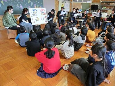 今日は、3校時に2年生向けの読み聞かせをしていただきました。オープニングの演奏から始まり、先生達の読み聞かせによる「おかえし」、さくら草の会の方々による読み聞かせ「おこだでませんように」、「ねこのピート」、「すてきな三にんぐみ」、「たべものたろう」など、子ども達は多くの本にふれることができました。