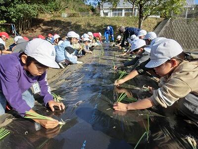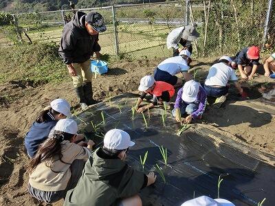 2校時に、3年生が新玉ねぎを植えました。学校協力者の方に、マルチの穴開けをしていただき、子ども達が一人7本ずつくらいの苗を植えていきました。茎が折れないように下の膨らんだところを持って穴に入れ、土を寄せてしっかりと植え込みました。これから、水やりや草取りなどのお世話をしていき、2月頃には収穫できそうだということです。