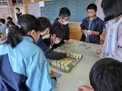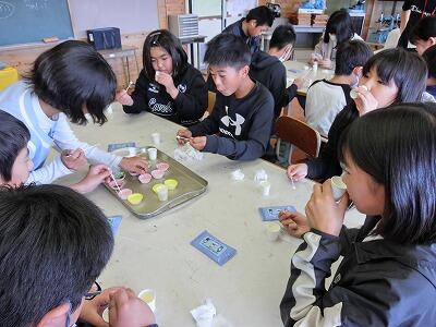 3校時に、5年生を対象として「味覚の授業」を行いました。ぶどうグミを、鼻をつまんで口に入れ10回程噛んでみても、あまり味を感じないという体験や、五味をそれぞれ味わったり組み合わせて味わったりという体験をしました。味の組み合わせでは、出汁に塩を加えてお吸い物の味になることや、酢に砂糖を加えて甘酸っぱくチキン南蛮のもとになるような味になることなどを体験しました。舌にあって、味を感じる「味蕾」は、子どもの時ほど多いそうです。苦味や酸味に苦労しながらも、子ども達は友達と一緒に様々な味を楽しんでいました。