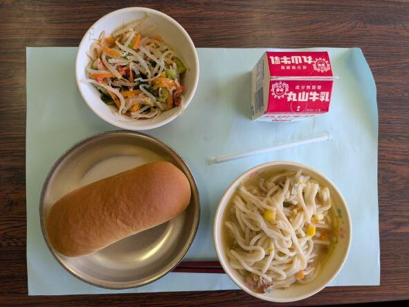 今日の献立は、ラーメン、青梗菜のナムル、コッペパン、牛乳です。子どもたちの大好きなラーメン、給食なので作って時間がたってしまうため、麺が軟らかくなってしまいますが、とてもおいしかったです。