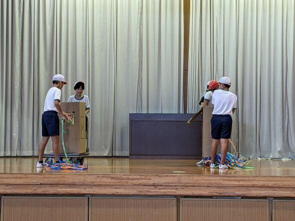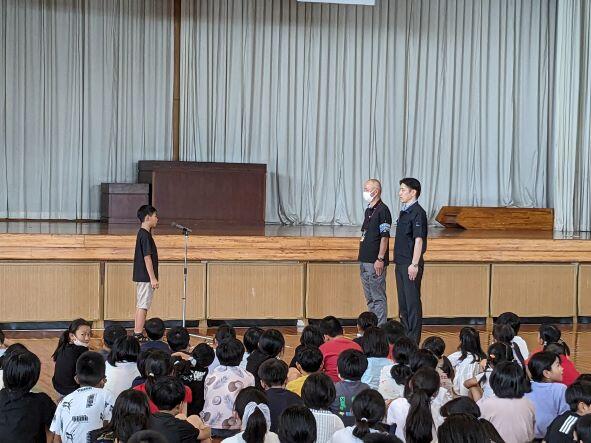 朝の時間に結団式がありました。体育委員会が進行し、まず5年生がステージに立って運動会のスローガンを披露しました。その後にA団、B団の団長等が紹介され、それぞれの団長はステージに登壇し、赤団、白団を決定しました。運動会まで約1ヶ月ですが、暑さに負けず団長を中心に、みんなで協力して頑張ってほしいと思います。