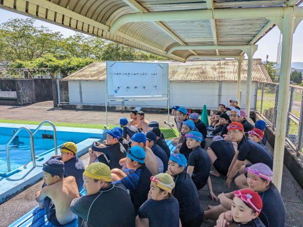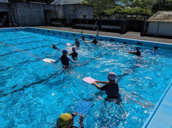 梅雨明けかと思うくらい、雲一つない晴天のもと、水泳学習が行われています。5年生では2つのグループに分かれて、基礎・基本の徹底を図りながら学習を進めています。今日はビート板を使い、バタ足の動きをチャックしながら泳いでいました。見学者もタブレットをもって、泳いでいる児童の動画を撮って、練習の工夫につなげています。水泳はとにかく泳ぐことが大事ですから、繰り返し泳ぎ、泳力を高めてほしいです。