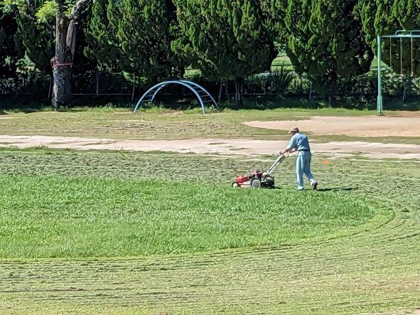 本校には市の技術職員として北林先生が勤務しており、花の苗を育てたり、校庭の草刈りや剪定、いろいろな修理等もしており、学校の施設整備等を日々行っています。今日も暑い中、運動場の草刈りを行っていました。草を刈ってもすぐに生えてくるので、大変な仕事ですが、黙々とがんばっています。やはり学校がきれい、整理されていると子どもたちの心もきれいになります。環境が人を作るとよく言われますが、本当にその言葉通りだと私は思います。子どもたちが素直で、心優しく成長するためにも、しっかりと環境整備に努めていきたいと思います。