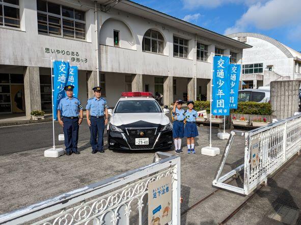 交通少年団に所属している本校の4年生2人が、朝、正門近くで、パトカーに乗って、「登校中は悪ふざけや道路への飛び出しをしない」「自転車の2人乗りや二列になって乗らない」などの交通安全の呼びかけを行ってくれました。みんなで交通ルールを守り、事故のない延岡市にしましょう。