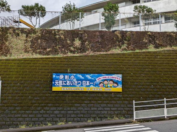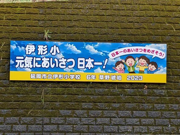 今年度、子どもたちから標語を作ってもらい、学校前の看板と幟を製作することとなりました。では、伊形小学校あいさつ標語の結果を発表します。