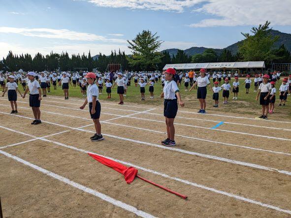 今日は1年生が運動会の練習を運動場で行っていました。はじめは一列に整列するのに時間がかかっていましたが、少しずつ慣れてきたようで、しっかり一直線に並ぶことができました。