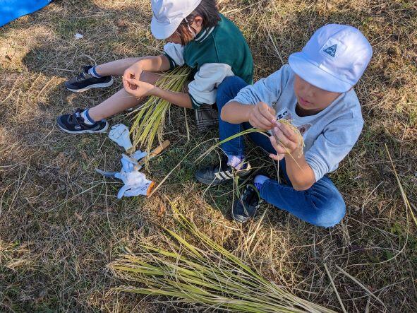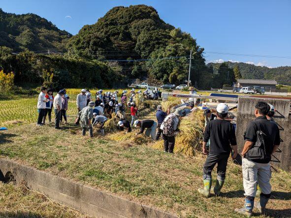 5年生が稲刈りを行いました。地域の方々からの協力を得ながら、餅米の収穫を行いました。子どもたちはまず、鎌を使って稲を刈る仕方を丁寧に教えていただきました。そして、田植えの時に植えた一本苗がどのくらい分けつし、何粒の米が実ったのかを調べました。そして、そのほかの穂も鎌で刈り、残りは大きなコンバインで収穫しました。籾は大きな袋で5つくらいありましたが、例年よりはまだ少ないということでした。この後12月12日(火)に餅つきが行われる予定です。楽しみですね。