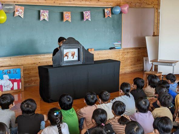 今日は2時間目から4時間目まで、1年生から3年生を対象にお話会を行っていただきました。読み聞かせボランティアの方々に読み聞かせ等を行っていただきましたが、とっても楽しい雰囲気の中で子どもたちは集中して聞き入っていました。途中着ぐるみも登場し、会場は大賑わい。楽しい時間を準備していただき、本当にありがとうございました。
