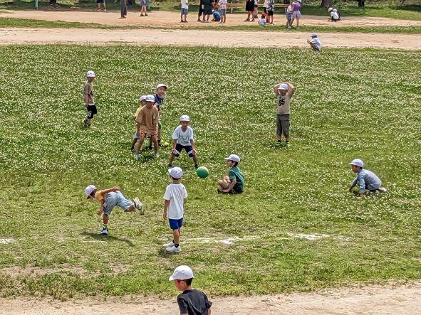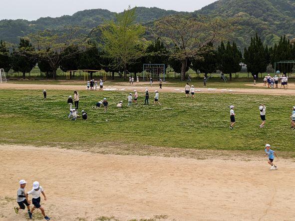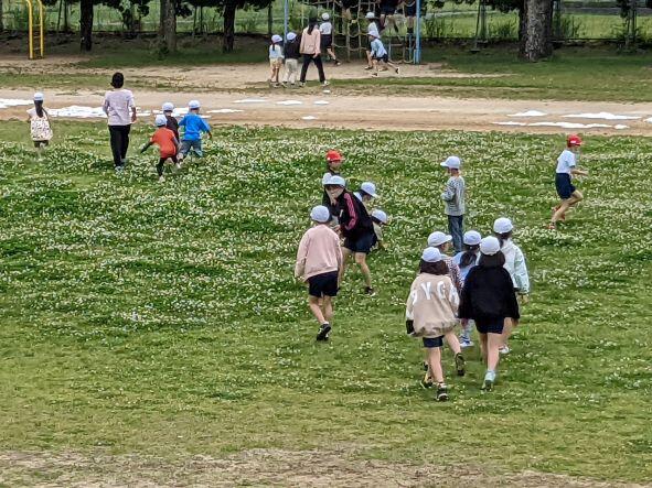 昼休みに運動場の様子を眺めにいきました。運動場にはたくさんの子どもたちがドッジボールをしたり、鬼ごっこをしたり、真ん中に群生しているシロツメクサを摘んだりと楽しい昼休みを過ごしていました。