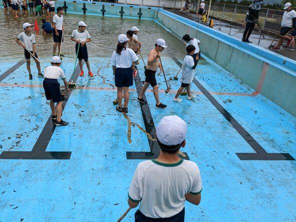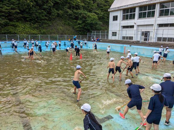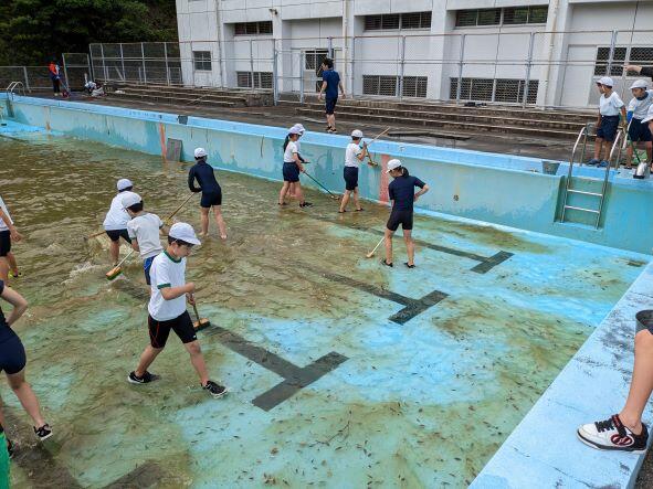 今日は5・6年生が5・6校時目にプール清掃を行いました。1年分の汚れがたまっていましたが、みんなで協力してきれいなプールになりました。枯れ葉や鳥の糞もあり、悪戦苦闘しました。途中で自分たちを鼓舞するかのように変なかけ声も始まり驚きましたが、みんなで心を一つにして最後までしっかりとがんばりました。水泳の授業が始まるのが楽しみですね。