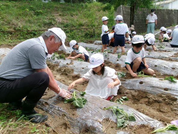 13名の学校協力者、8名の保護者も参加していただき、子どもたちと一緒に植えました。地域や家庭の協力で学校の授業ができることは本当に幸せなことだと思います。子どもたちも笑顔いっぱいで楽しく芋植えができていました。芋掘りまでの水やりや雑草取り、成長の記録などいろいろすることがありますが、みんなと協力して取り組んでほしいと思います。