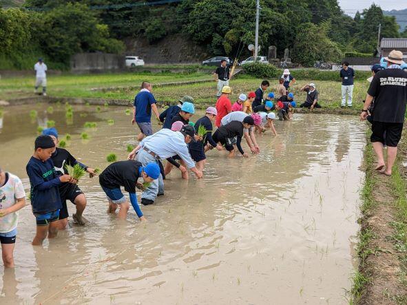 今日は5年生が田植えを行いました。学校近くのお借りしている田んぼに集まり、稲吉さんから苗の植え方を教えていただいたり、東臼杵農林振興局の職員の方から、田んぼの役割について説明をしていただきました。