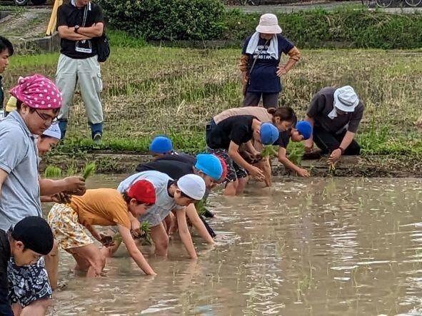 説明などを聞いた後は、早速苗を植えていきました。少し水が多かたので苗を植えるのに苦労していましたが、子どもたちはとっても元気よく楽しく植えることができていました。1本の苗からどのくらい収穫できるかという課題も与えられ、これからの苗の生長を見守る意欲が高まったと思います。観察や草取りなども行いながら、餅つきまでしっかりと頑張ってほしいと思います。協力していただいた皆様ありがとうございました。