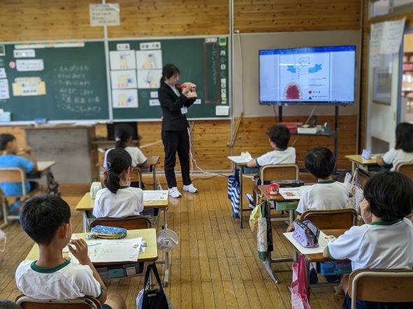 人と動物のつながりについて学び、いのちについて考える内容の授業でした。実際に聴診器を使って、自分の心臓が動いていることを確認する場面もあり、いのちの大切さについてもしっかりと学ぶことができました。