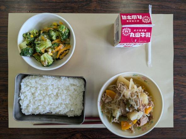 今日の献立は、肉じゃが、ブロッコリーとコーンのサラダ、ご飯、牛乳です。