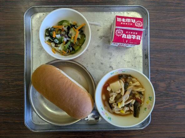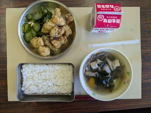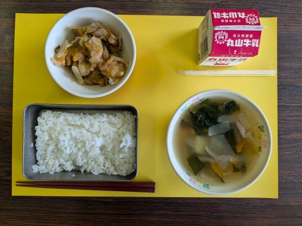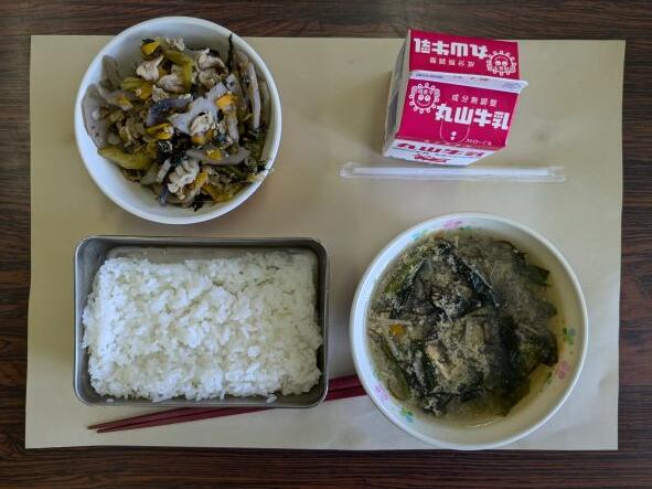 今日の献立は、もずくスープ、レンコンと豚肉のピリ辛炒め、ご飯、牛乳です。レンコンと豚肉のピリ辛炒めは、ピリ辛の味付けが白ご飯に合っていて、暑い日には食欲もアップするメニューです。ご飯を2杯食べたくなりました。おいしかったです。