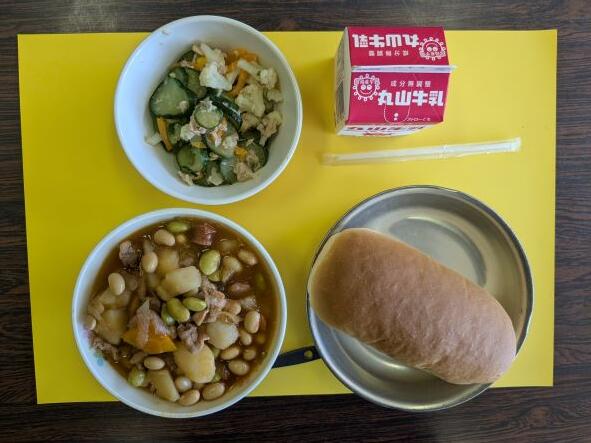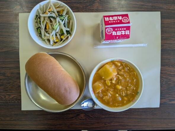 今日の献立は、鶏肉トマトシチュー、ゴボウサラダ、牛乳、コッペパンです。今日も朝から暑いですが、鶏肉トマトシチューも熱かった!汗をかきながらトマトシチューを食べで、暑い夏を超えていこうという気持ちになりました。トマトシチューは初めて食べましたが、パンよりご飯にも合うかなと思いました。おいしかったです。