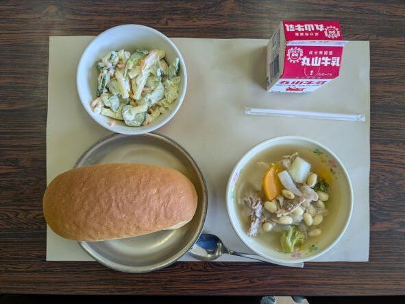 今日の献立は、しろはなまめのポトフ、マカロニサラダ、コッペパン、牛乳です。子どもたちの大好きなマカロニサラダをコッペパンに挟んで食べました。とてもおいしかったです。ポトフもいろいろな野菜が入っていて薄味でとてもヘルシーでした。