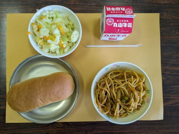 今日の献立は、ミートソーススパゲティ、カリフラワーサラダ、コッペパン、牛乳です。