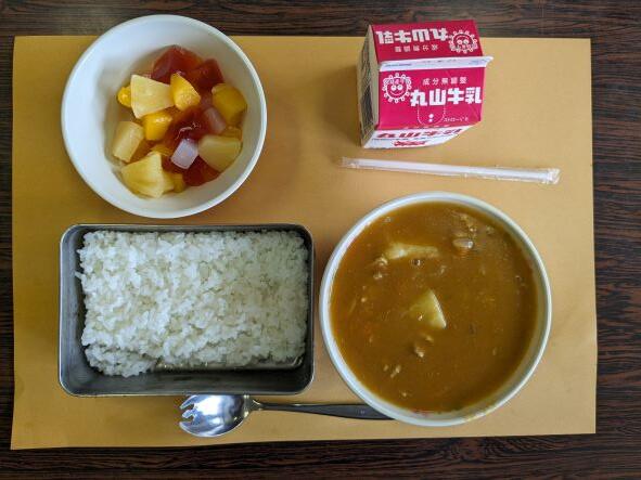 久しぶりのカレーライス、スパイスがきいてとてもおいしかったです。フルーツナタデココも子どもたちが大好きなメニューです。今日は残菜が少なかったことでしょう。