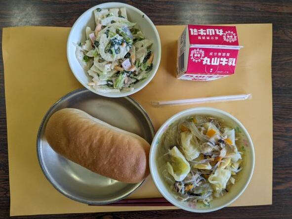 今日の献立は、太平燕、レンコンの辛子和え、コッペパン、牛乳です。今日は熊本県郷土料理ということで太平燕とレンコンの辛子和えでした。太平燕はある熊本出身のタレントが学生時代によく通って食べていたことを紹介したことで全国的にも有名になりました。ちゃんぽんと同じで出汁がでていて、とてもおいしかったです。