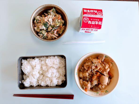 今日の献立は、ジャガイモのうま煮、ブロッコリーのおかかマヨ和え、牛乳、ごはんです。