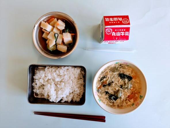 今日の献立は卵入り野菜団子汁、ポテトサラダ、ご飯、牛乳です。 台風の影響で昨日の給食がなくなったため、今日が2学期初めての給食となりました。約1ヶ月ぶりの給食でしたが、とてもおいしかったです。2学期もおいしい給食よろしくお願いします。