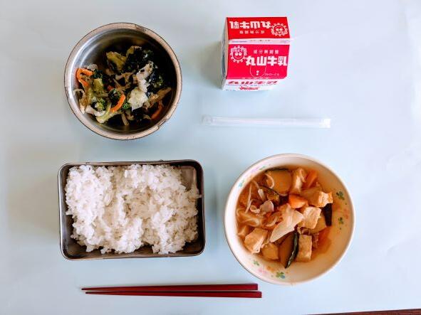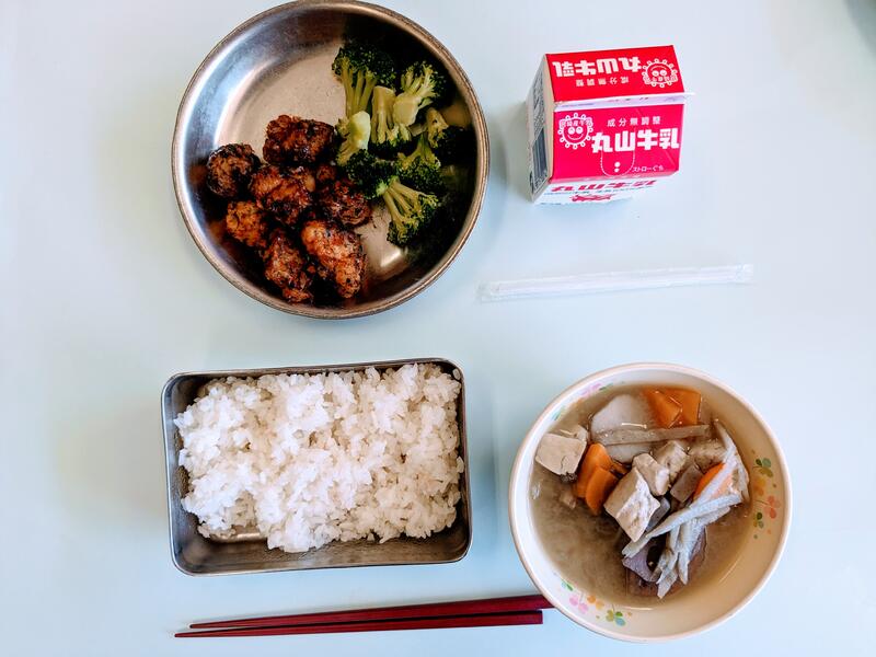 今日の献立は、レンコンと豚肉のピリ辛炒め、根菜汁、ご飯、牛乳です。レンコンのサクッとした感触と豚肉が入ってぴりっとした辛さが子どもたちにちょうど良いくらいで、とてもおいしかったです。