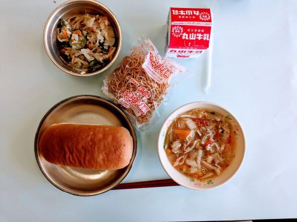 今日の献立は、ミネストローネ、小松菜とウインナーのサラダ、コッペパン、牛乳です。