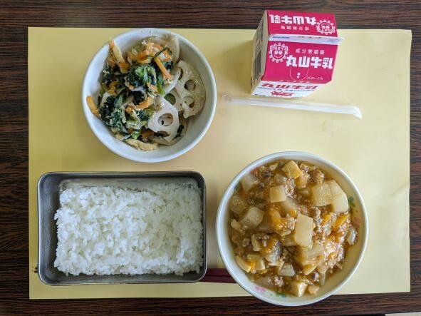 今日の献立は、麻婆大根、レンコンのごま和え、牛乳、ごはんです。麻婆大根は大根嫌いの子どもでも、食べられるように麻婆豆腐の中に豆腐と同じ形・大きさで切られた大根が一緒に入っています。とてもおいしかったです。レンコンも普段はあまり食べないので、食物繊維たっぷりのごま和えもとてもヘルシーでおいしかったです。