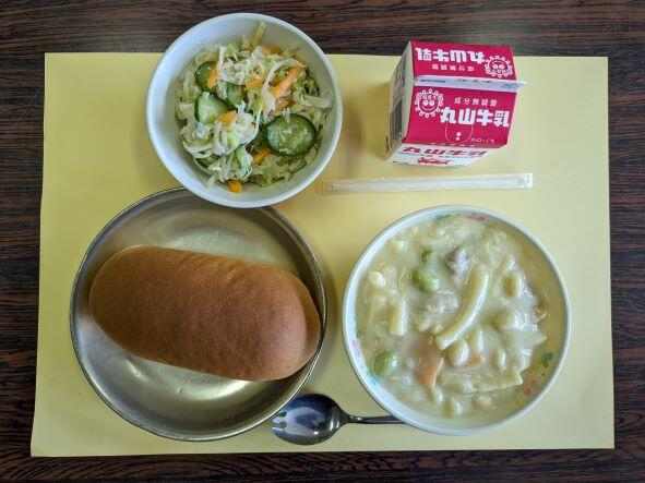 さて、今日の献立はマカロニと大豆のクリーム煮、しゃきしゃきサラダ、牛乳、コッペパンです。クリーム煮にはマカロニと大豆が入っていますが、大豆はとても柔らかく、クリーミーな味でとてもおいしかったです。しゃきしゃきサラダはコッペパンに挟んで食べましたが、少し酸味がありパンもおいしくいただきました。