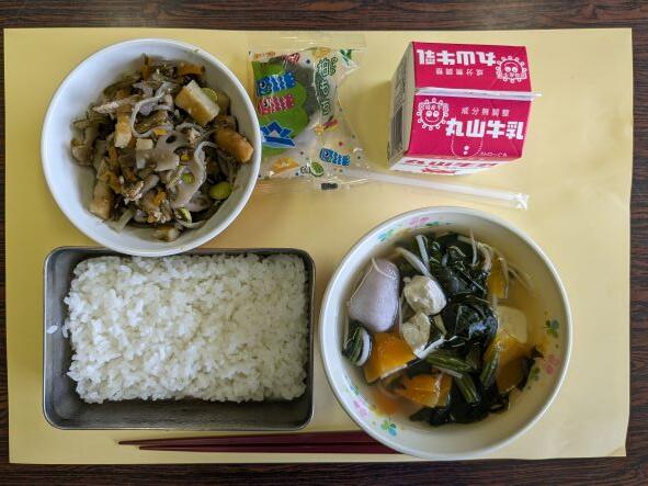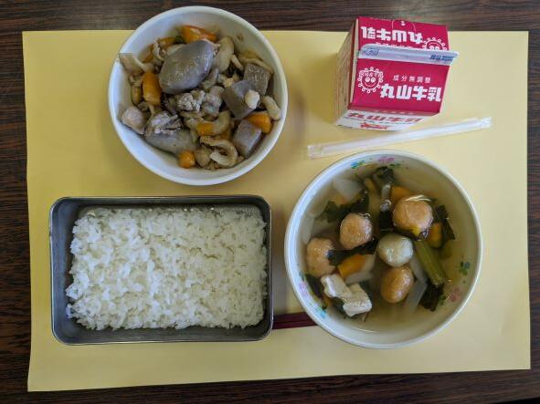 今日の献立は、筑前煮、野菜団子汁、牛乳、ご飯です。今日は福岡県の郷土料理・筑前煮でした。筑前煮は、別名「がめ煮」といわれます。博多弁の「がめくり込む」=「寄せ集める」が名前の由来とも、文禄の役、朝鮮出兵した兵士が「どぶがめ」と呼ばれていたスッポンとあり合わせの材料を煮込んで食べたのが始まりとも言われているそうです。スッポンでなく鶏肉でしたが、たくさんの材料が入っていて、とてもおいしかったです。