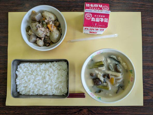 今日の献立は、なすの味噌汁、さといものそぼろ煮、牛乳、ごはんです。なすを使った味噌汁は、旬の野菜なのでとてもおいしかったです。さといものそぼろ煮は、里芋が柔らかく煮ており、子どもたちもたべやすくおいしかったです。