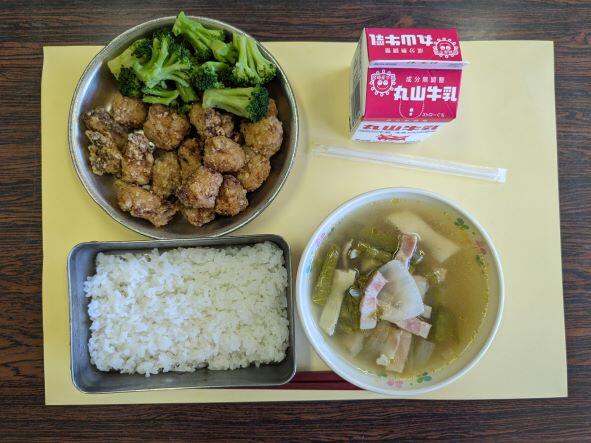 今日の献立は、魚のスパイシー揚げ、添え野菜、春野菜のスープ、ご飯、牛乳です。