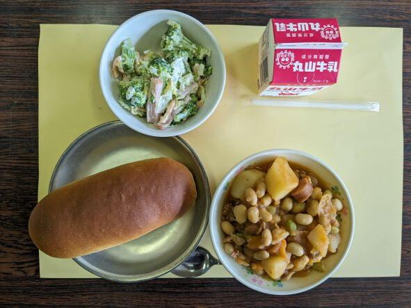 今日の献立は、チリカンコン、ブロッコリーのハムマヨサラダ、チーズパン、牛乳です。チリカンコンは代表的なメキシコ料理でチリコンカルネ、チレコンカルネとも呼ばれるそうです。ジャガイモや大豆などとても柔らかく煮られていてとてもおいしかったです。