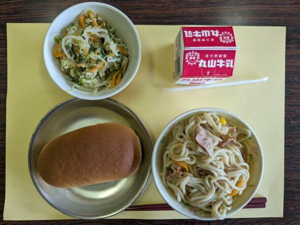 今日の献立は、ラーメン、棒々鶏、牛乳、コッペパンです。ラーメンはあまり給食では出ませんが、豚骨風味でコクがあっておいしかったです。棒々鶏も野菜たっぷりでさっぱりしていておいしかったです。