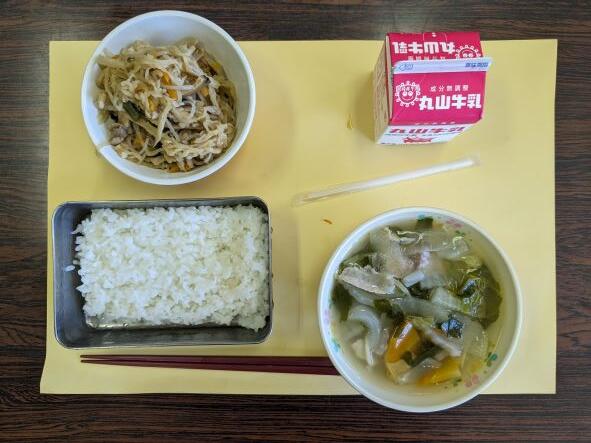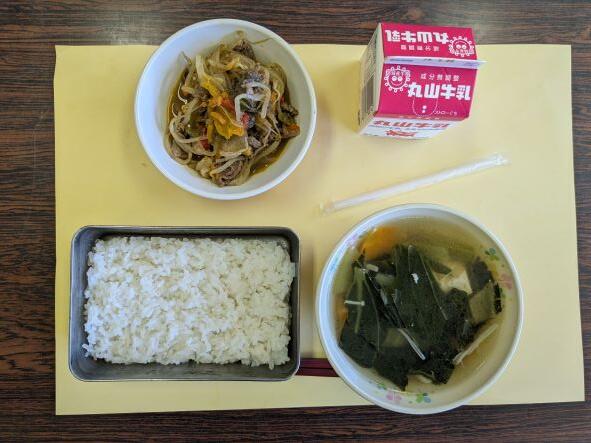 今日の献立は、中華スープ、プルコギ、ご飯、牛乳です。プルコギは、朝鮮半島の代表的な肉料理の一つで、醤油ベースで甘口の下味をつけた薄切りの牛肉を野菜や春雨と共に焼いたり、あるいは煮たりする朝鮮料理です。甘口の醤油味でとても白ご飯にあいますね。今日もおいしくいただきました。