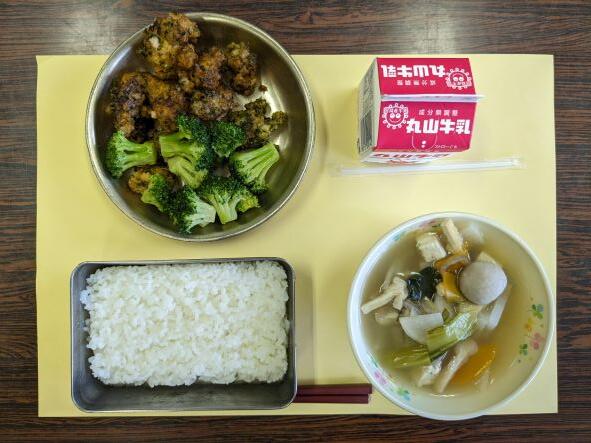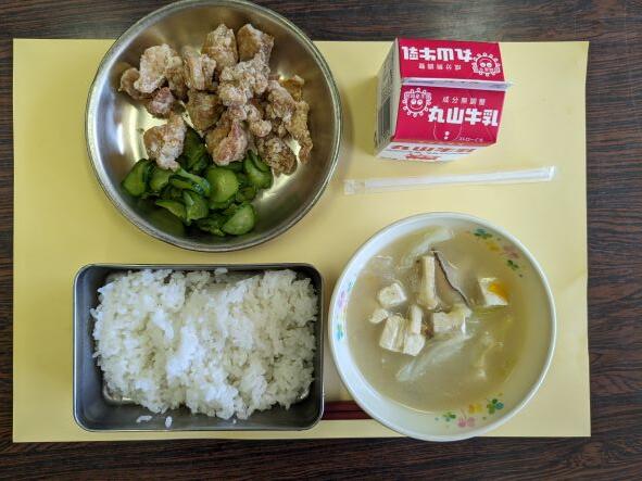 今日の献立は、鶏の唐揚げ、添え野菜、春キャベツの味噌汁、ご飯、牛乳です。