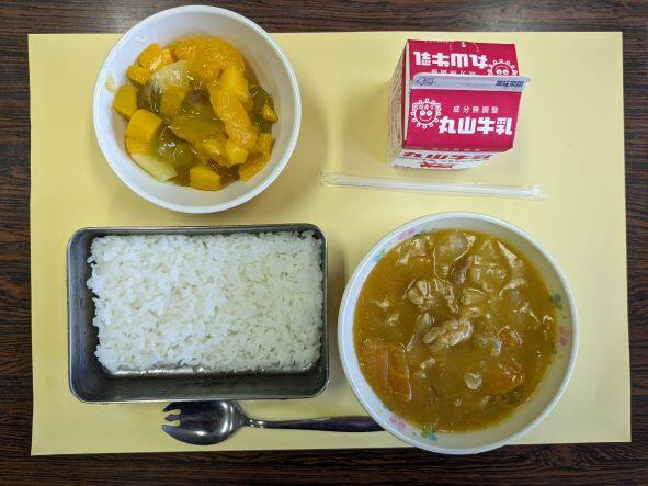 今日の献立は、カレーライス、フルーツポンチ、牛乳です。今年度初めてのカレーライスです。1年生にとっては、初めてのカレーライスとフルーツポンチ。Wでおいしいので、残さず食べてほしいですね。