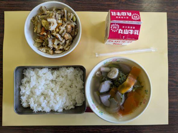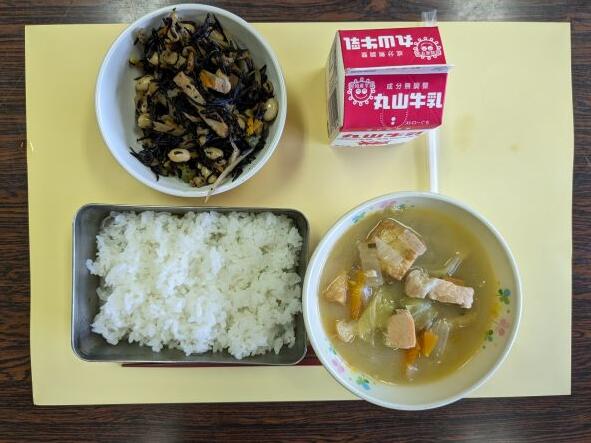 今日の献立は、ひじきの炒り煮、石狩汁、牛乳、ごはんです。ひじきの炒り煮は大豆やひじきが軟らかく少し甘味に煮込んでおり、子どもたちは好んで食べられそうでした。石狩汁も鮭や野菜がたくさん入って煮込んでいて、しっかり出汁が出て味噌味でとてもおいしく、身体も温まりました。