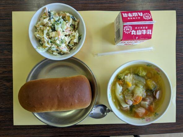 今日の献立は、揚げパン、野菜スープ、グリーンサラダ、牛乳です。
