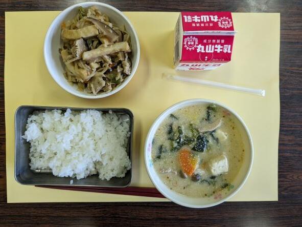 今日の献立は、飛鳥汁、千切り大根の炒め、ご飯、牛乳です。飛鳥汁は初めて食べました。インターネットで調べてみると、歴史が古い料理で、約1300年前の飛鳥時代に中国(唐)から、牛乳と鶏肉料理が伝わり、貴族の間で食されるようになってから、この料理ができたそうです。鶏肉の入った味噌汁に牛乳が入った感じで、ブイヨンなどで洋風に仕上げられており、まろやかでとてもおいしかったです。
