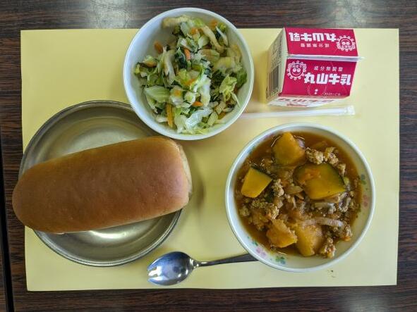 今日の献立は、カボチャのミートソース煮、ちくわと小松菜のサラダ、牛乳、黒糖パンです。